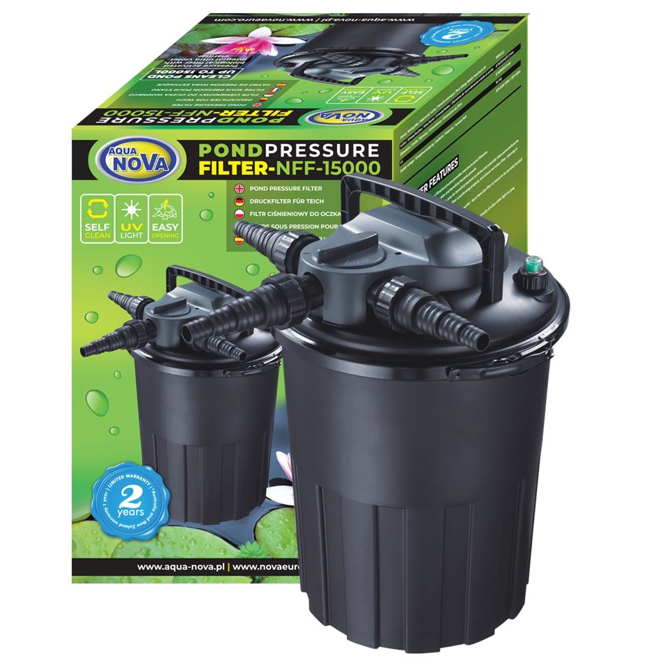 Aqua Nova NFF-15000 - водяний фільтр для ставка з ємністю до 15 000 л. Завдяки вбудованому УФ-С 36 Вт та багатоступеневої механічної біологічної фільтрації та стерилізує воду. Швидке очищення та індикатор бруду. вставки фільтру в наборі. Особливості ключових особливостей: