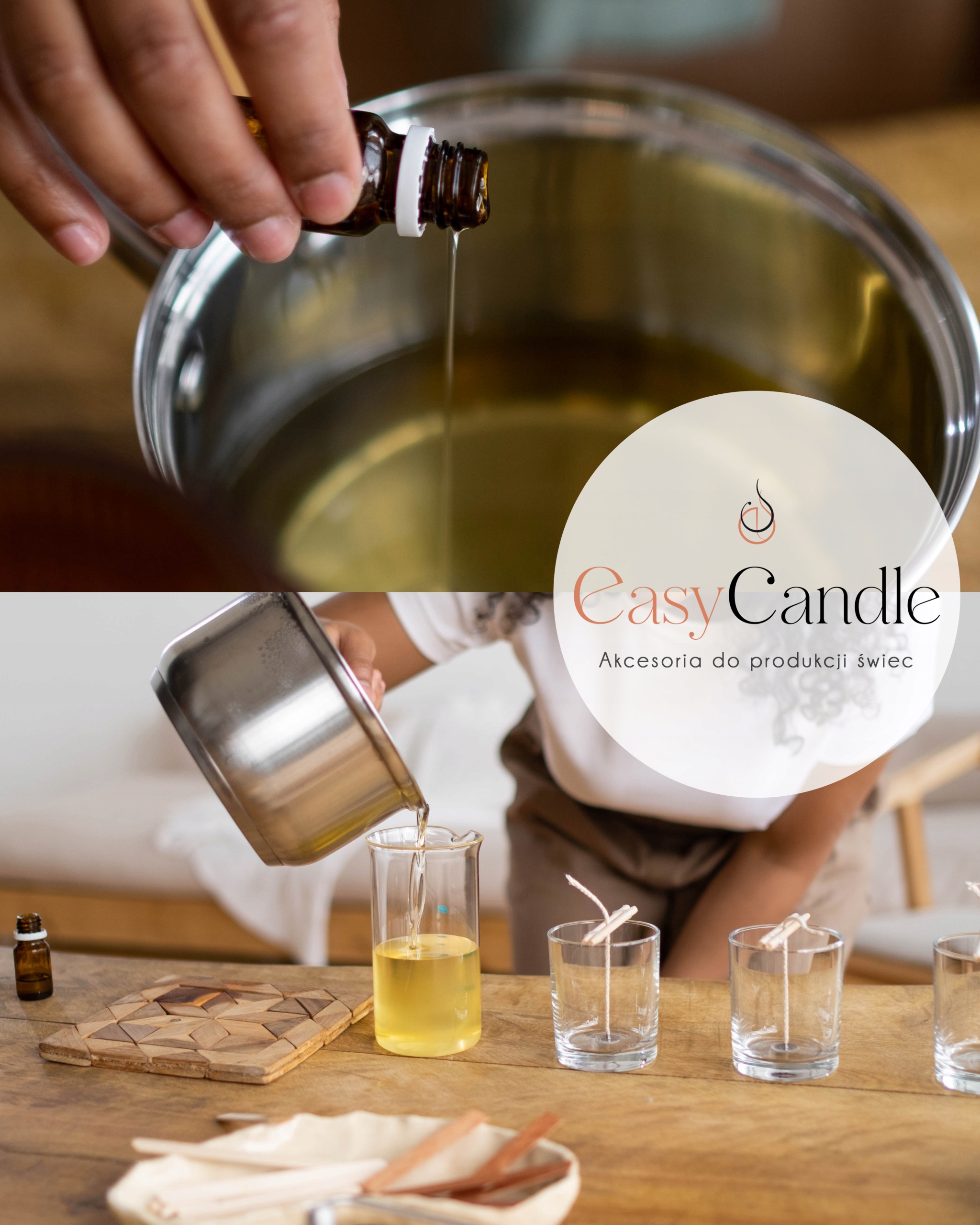 Ароматична олія для виробництва свічок в екологічно чистій коричневій скляній пляшці, яка захищає олію від інтенсивного світла. Масло можна змішувати з рослинним воском, таким як соєвий віск, кокосовий віск, ріпаковий віск, пальмовий віск, а також з парафіном або парафіновим гелем.