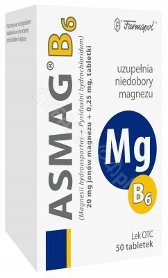 Упаковка містить 50 таблетки Asmag B6 . У склад 1 таблетки препарату включають 300 мг аквапатенату магнію (що відповідає 20 мг іонів магнію) та 0,25 мг вітаміну В6, а також допоміжних інгредієнтів. Магній, що міститься в препараті, доступний у свердловині, а також, крім того, його поглинання підтримується вітаміном В6. Перш ніж вживати препарат, прочитайте до нього листівку, приєднану до нього, і - якщо лікар не вказує на інше - дотримуйтесь показань, що містяться в ньому. Дозування ASMAG B6, рекомендована у листівці у дорослих пацієнтів та підлітків у віці 12 років - 3 таблетки, взяті 4 рази на день. При введенні таблеток ASMAG B6, дітям рекомендується для іншої дози - 1 таблетку на частоті 2-3 рази на день. Не приймайте більше ліків, ніж вказано в листівці або рекомендується окремо лікарем. Рекомендується приймати таблетки ASMAG B6 після їжі, попиваючи їх потрібною кількістю води.