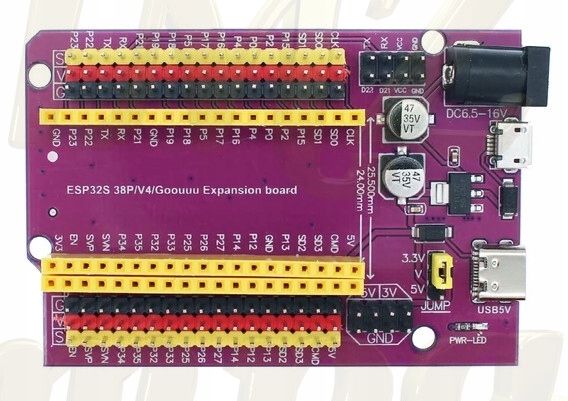Термінальний адаптер v4 Goldpin - ще одна версія універсальної плитки для полегшення прототипування та побудови пристроїв. Ця плитка оснащена системою живлення. Це рішення особливо зручне для проектів, що використовують більшу напругу або струми. Наприклад, двигуни, сервоханізм, реле тобто тощо. Він відповідає всім модулям розвитку esp32 з видаленням 38 PIN . Обидві