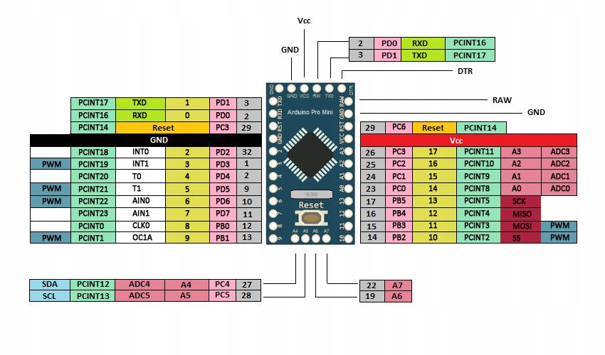 - 7 аналогового входу (ADC) Communication: uart, SPI, I2C