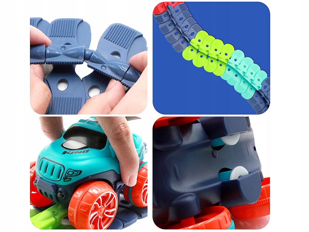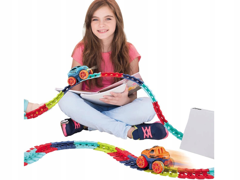 Набір містить аж 184 елементи, що дозволяє побудувати доріжку максимальною довжиною 440 см! Завдяки незвичайній формі з'єднувачів доріжку можна вільно змінювати, скручувати і створювати кути. Використовуючи дитячі стільці, книги або ящики, можна створити справжню смугу перешкод, повну підйомів і крутих спусків.