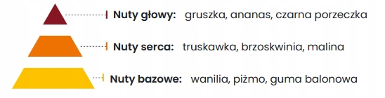 солодкий, фруктовий та енергетичний запах -справжнє повернення до безтурботних моментів. Губка бульбашки - це вибух літніх фруктів з натяком на дитячу радість. Нотки голови груш, ананаса та чорної смородини переходять у серце, сповнене полуницею, персиків та малини. Основа - це солодка ваніль, мускус і характерна нота балонної гуми. Наповнює простір ароматом, який викликає посмішку та покращує настрій.