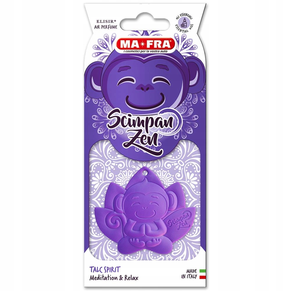 Scimpanzen Talc Spirit - Meditation & Relax - це фіолетовий автомобільний освіжувач повітря, що характеризується свіжим ноти бергамоту та флердоранжу, які поєднуються з теплотою сандалового дерева та кедра. Завдяки солодкості стручок ванілі та ароматуосвіжувач автомобіля створює неповторний пудровий аромат тальку, який може зачарувати та розслабити навіть найнеспокійніших духів.