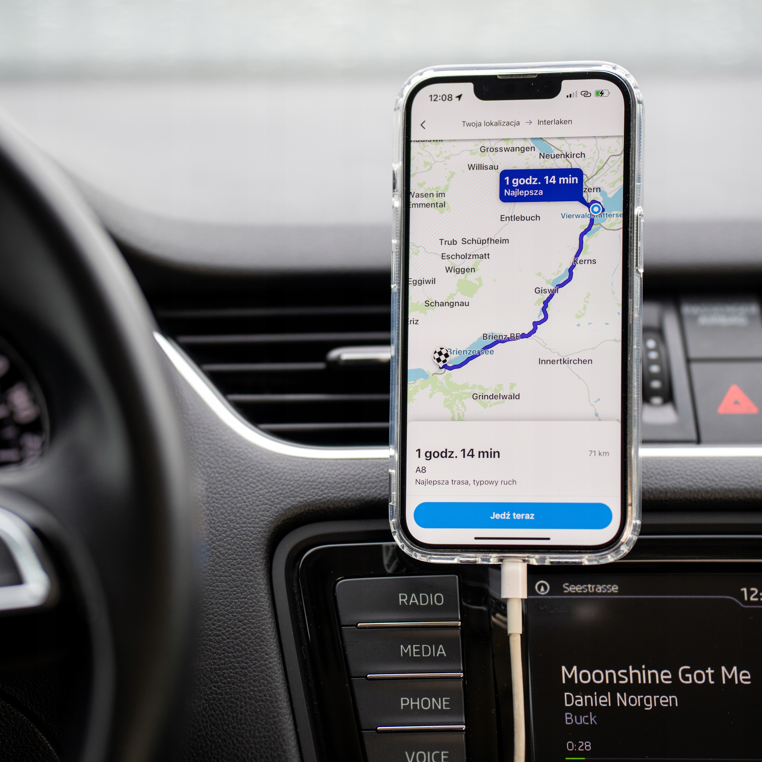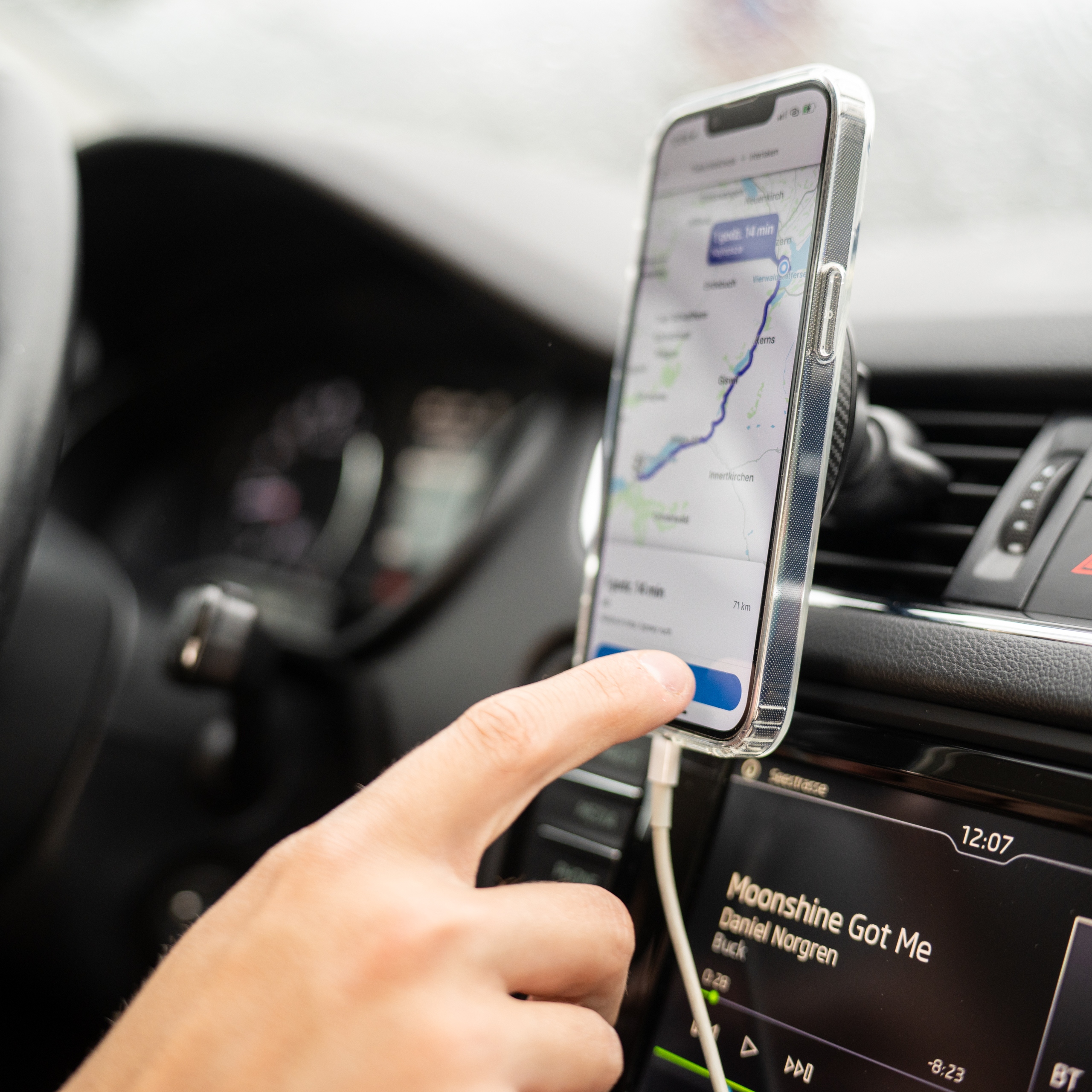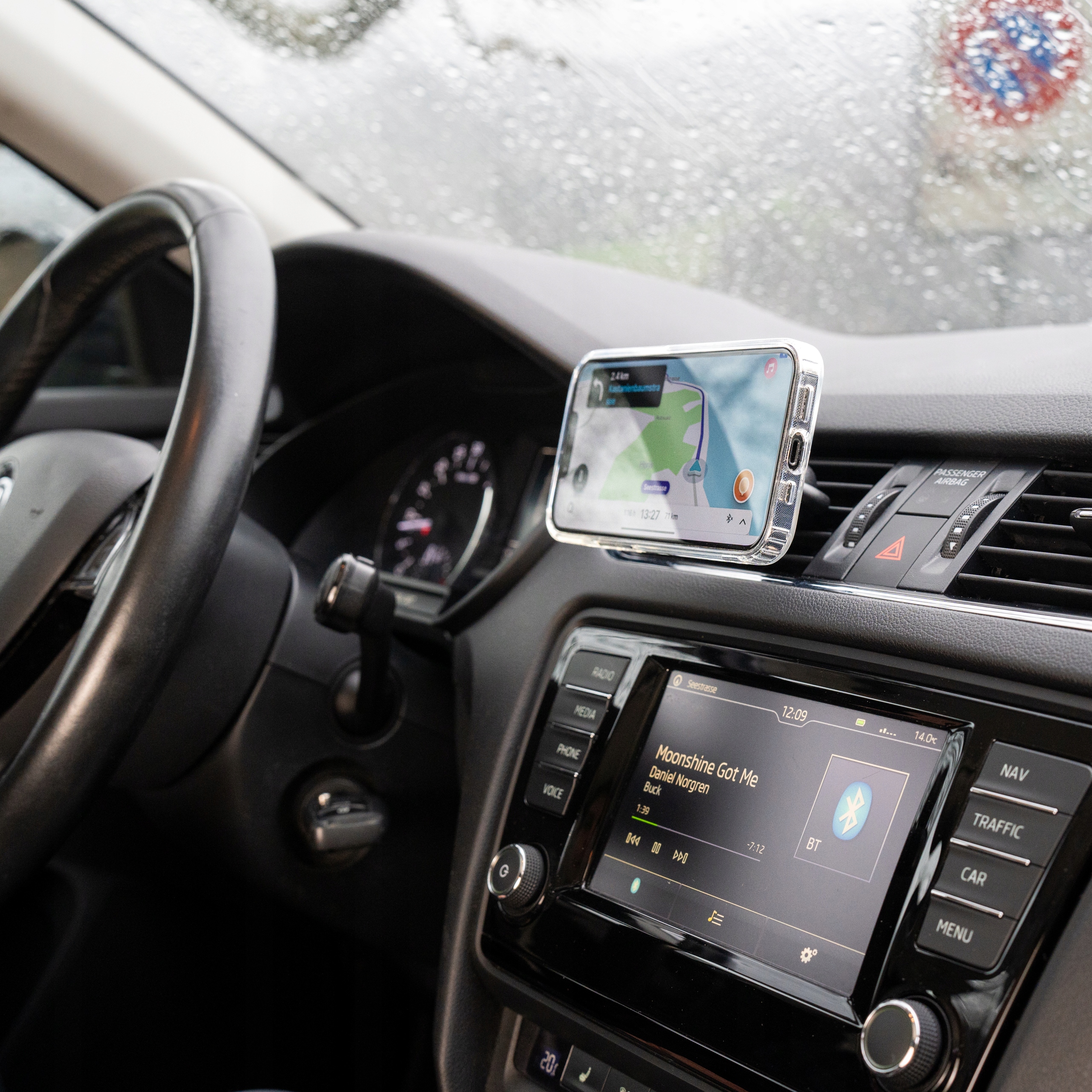 Тримач оснащений сильними магнітами, адаптованими до роз'єму MagSafe. Щоб закріпити телефон, просто покладіть його спиною до тримача.