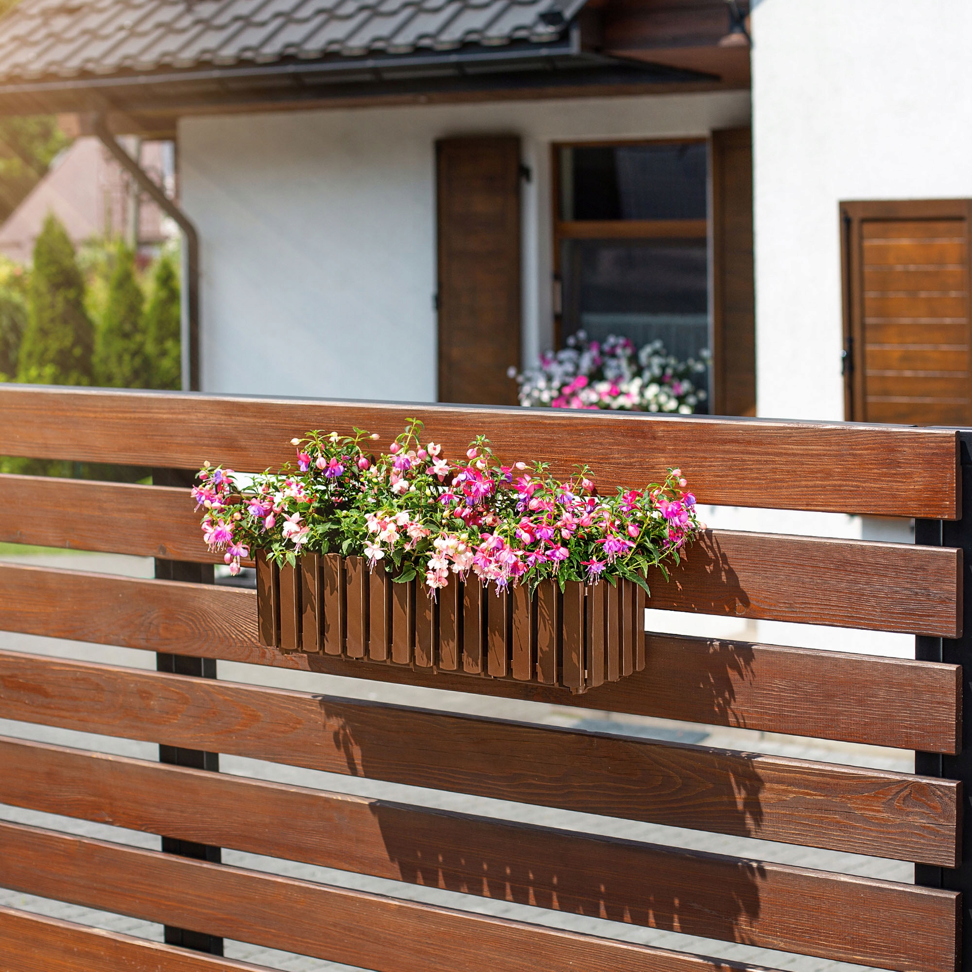 Прямокутна коробка укладена в мінімалістичні > ламелі, своєю формою імітують штахетник. Дерев'яна форма інепідвладний часу колір ідеально підійдуть до будь-якого балкона і тераси, ставши їх невід'ємною частиною.