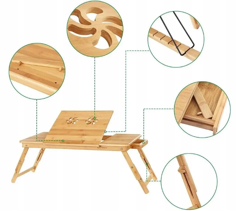Великий -формат: стільниця (розміри: 55 х 35 см) пропонує достатньо місця. Регульовані рівні, що лежать 5, відповідає різним кутовим потребам. Таблиця ідеально вписується в ноутбуки. Дерев’яна смуга запобігає ковзанню у випадку схилу