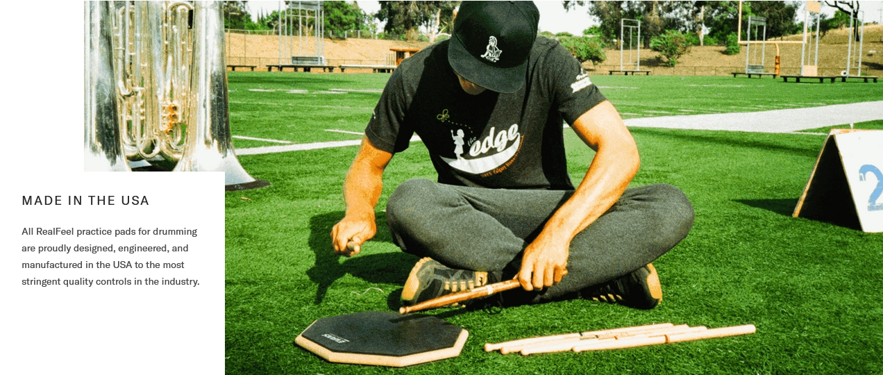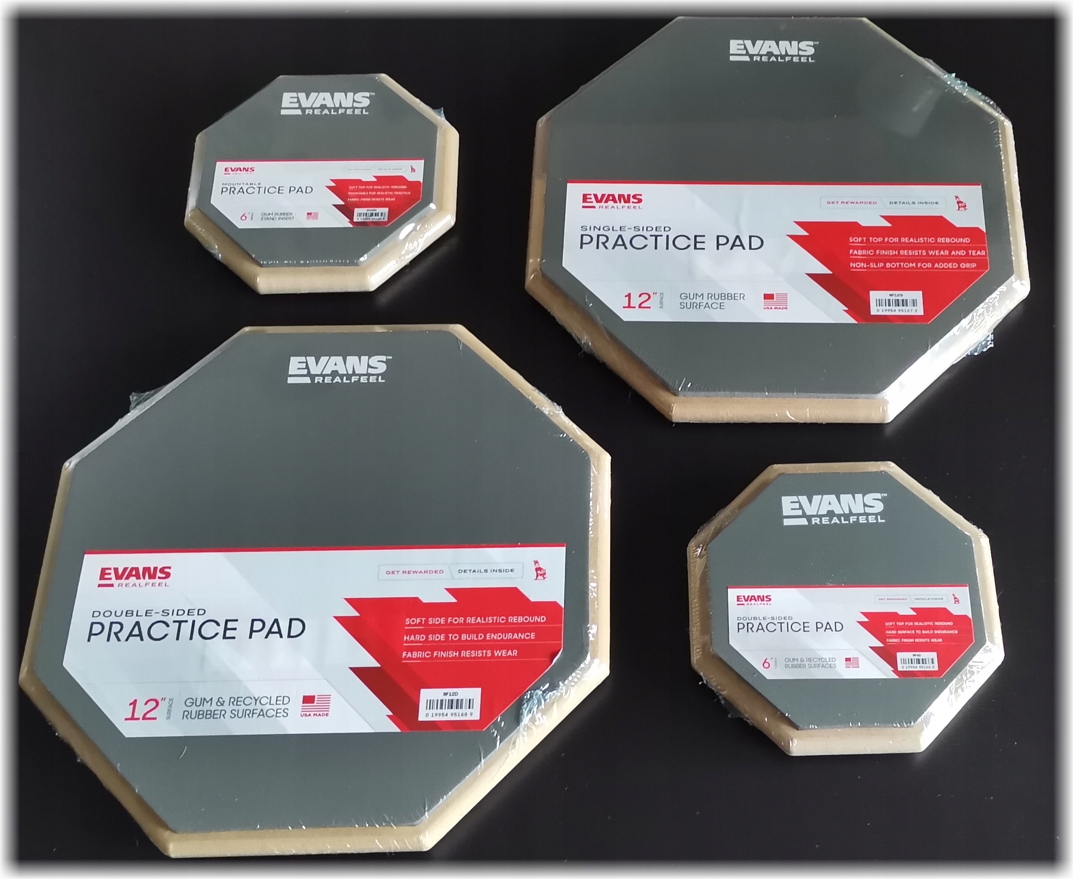 - Дві яскраві поверхні: [1] Сіра поверхня з логотипом EVANS - стандартна, гумова. (Реалістично відображає гру на малому барабані); [2] Чорна поверхня (на звороті планшета) - тверда. Він краще імітує удари по тарілках (вправи на ритм «Hi-Hat», «Ride»)