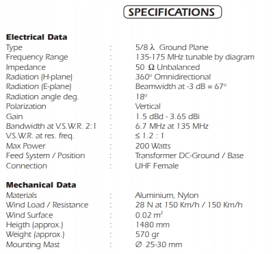 Посилення антени: 144 МГц 1,5 дБд – 3,65 дБі