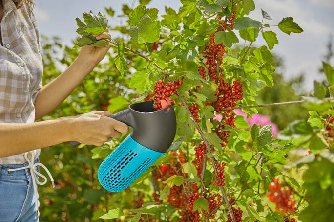 Завдяки практичній ручці для перенесення багатство можна використовувати для збору фруктів безпосередньо з куща. Ідеальний кут роботи забезпечує хороший вигляд зібраних фруктів. Обертаючий кінчик особливо практичний: вузькі зуби використовуються для збору чорничних фруктів і ширше для збору кам'яних фруктів. Ємність 0,8 л робить розпушувач достатньо великим, щоб зібрати більшу кількість слив та вишні. Завдяки маленькому нижньому колонтитулу, на землю можна розмістити машину для малювання фруктів ягід.