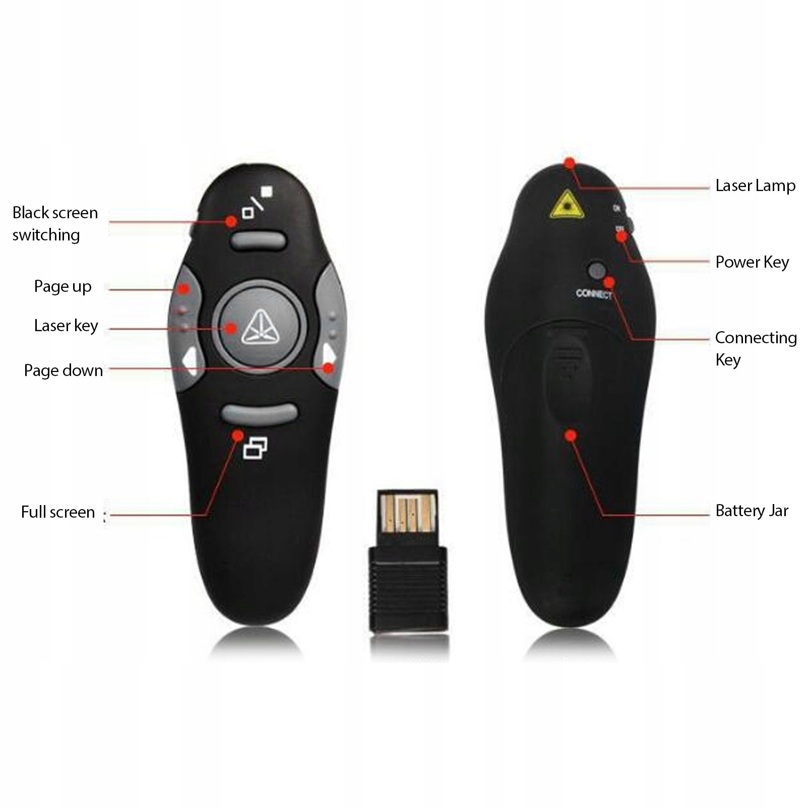 1. Віддалений контроль: Клацера презентації приймає бездротову технологію 2,4 ГГц, яка може віддалено керувати презентацією на відстані близько 15 метрів.