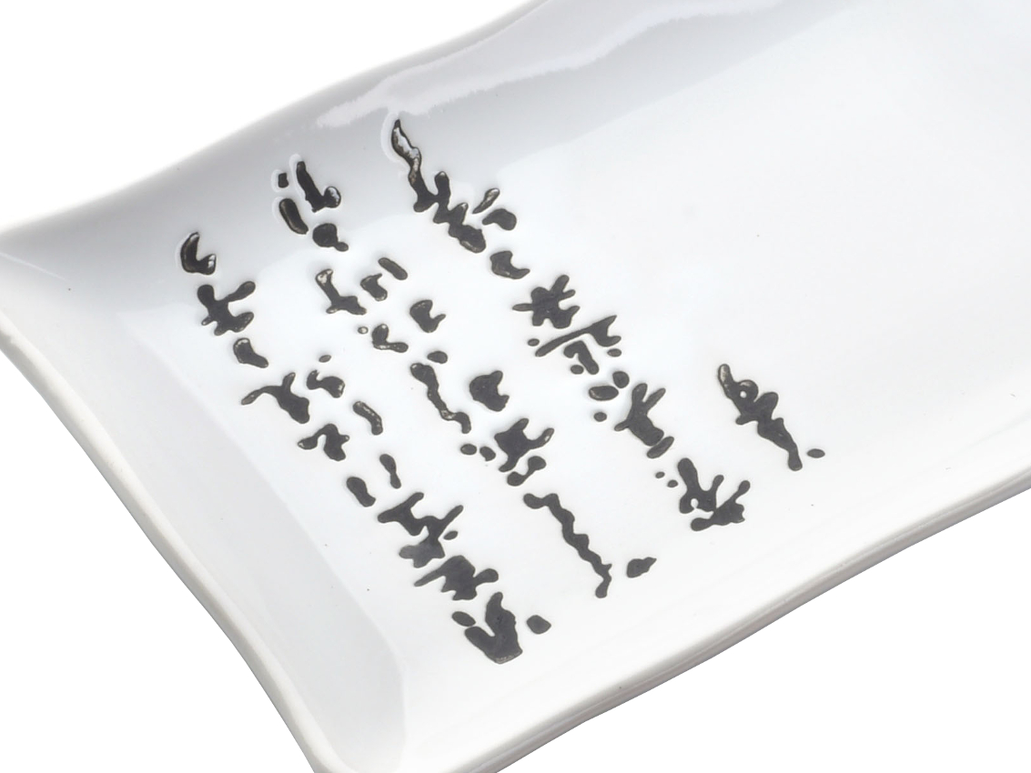 Посуд прикрашений темними японськими написами на білому тлі.