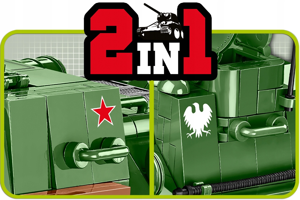СУ-100 — радянська самохідна установка, прийнята на озброєння в 1944 році. Виникнення цієї моделі пов'язане з необхідністю посилення самохідної артилерії в кінці війни. Новосконструйована гармата Д10 - 100 мм була встановлена на дещо модифікованому корпусі популярного СУ-85. У період 1944-46 років було випущено приблизно 4500 одиниць цього автомобіля. САУ була дуже популярна і використовувалася в десятках армій по всьому світу. Кілька країн досі тримають у бойовій готовності СУ-100 Модель САУ СУ-100 повністю розроблена з конструкційних блоків COBI. Використання аж 655 цеглинок дозволило точно відтворити цей транспортний засіб. Набір не містить наклейок. Блоки покриті якісними принтами, які не стираються навіть при інтенсивній експлуатації. Модель оснащена ефективною гусеничною тягою, рухомою гарматою і відкриваються люками. Під сервісною кришкою знаходиться привабливий на вигляд макет двигуна. У комплекті блоки з радянським і польським маркуванням на вибір. Все це доповнює фігура солдата з гвинтівкою Мосіна, кашкетом-ушанкою та червоним прапором. Чіткі інструкції містять список блоків і статистику, які ви можете використовувати в безкоштовній грі COBI Historical Battle Game.Набір ідеально підходить для створення діорам, що відтворюють Східний фронт. Набір SU-100 — ідеальна ідея подарунка для будь-якого фаната армії, незалежно від віку, і ідеальний початок пригод із конструктором COBI.