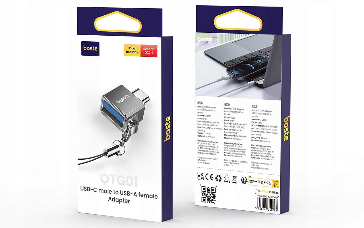 Оплачивая «Boste Adapter OTG USB-A (женщина) на передаче USB-C (мужчина)», вы можете быть уверены, что данное изделие из каталога «Адаптеры, адаптеры» будет доставлено из Польши и проверено на целостность. В цене товара, указанной на сайте, учтена доставка из Польши. Внимание!!! Товары для Евросоюза, согласно законодательству стран Евросоюза, могут отличаться упаковкой или наполнением.