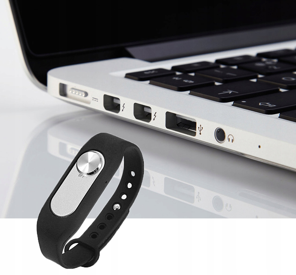 - Мініатюрний диктофон, захований у браслеті/брелоку, записує з якістю 128 Кбіт/с — маленький і непомітний для запису прихованих подій і для регулярного використання.
