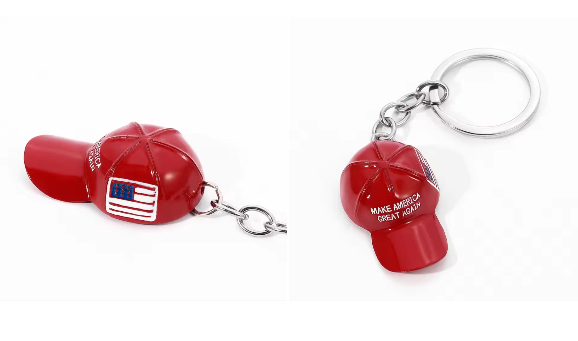- Дизайн: Стильний брелок із червоним капелюхом Трампа.