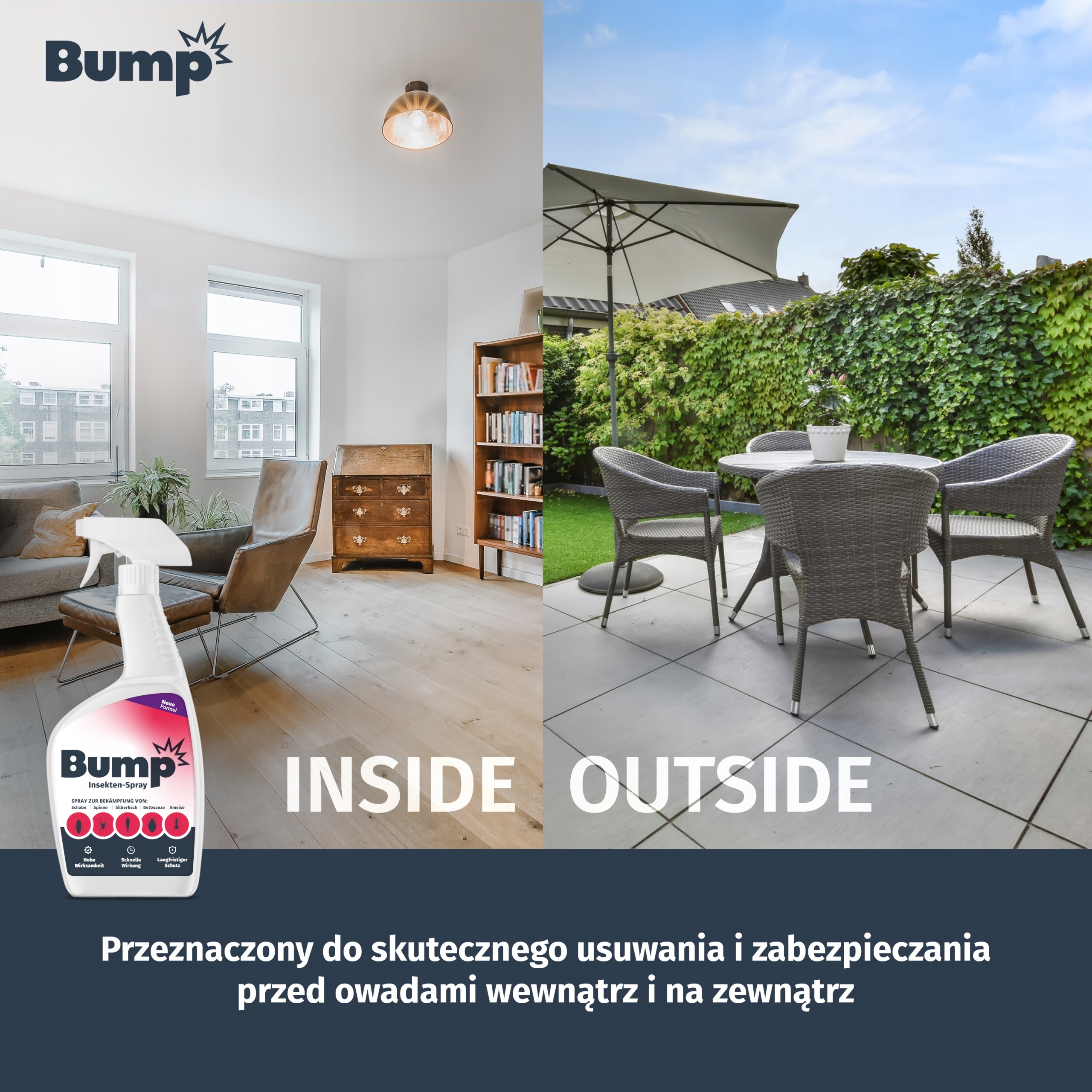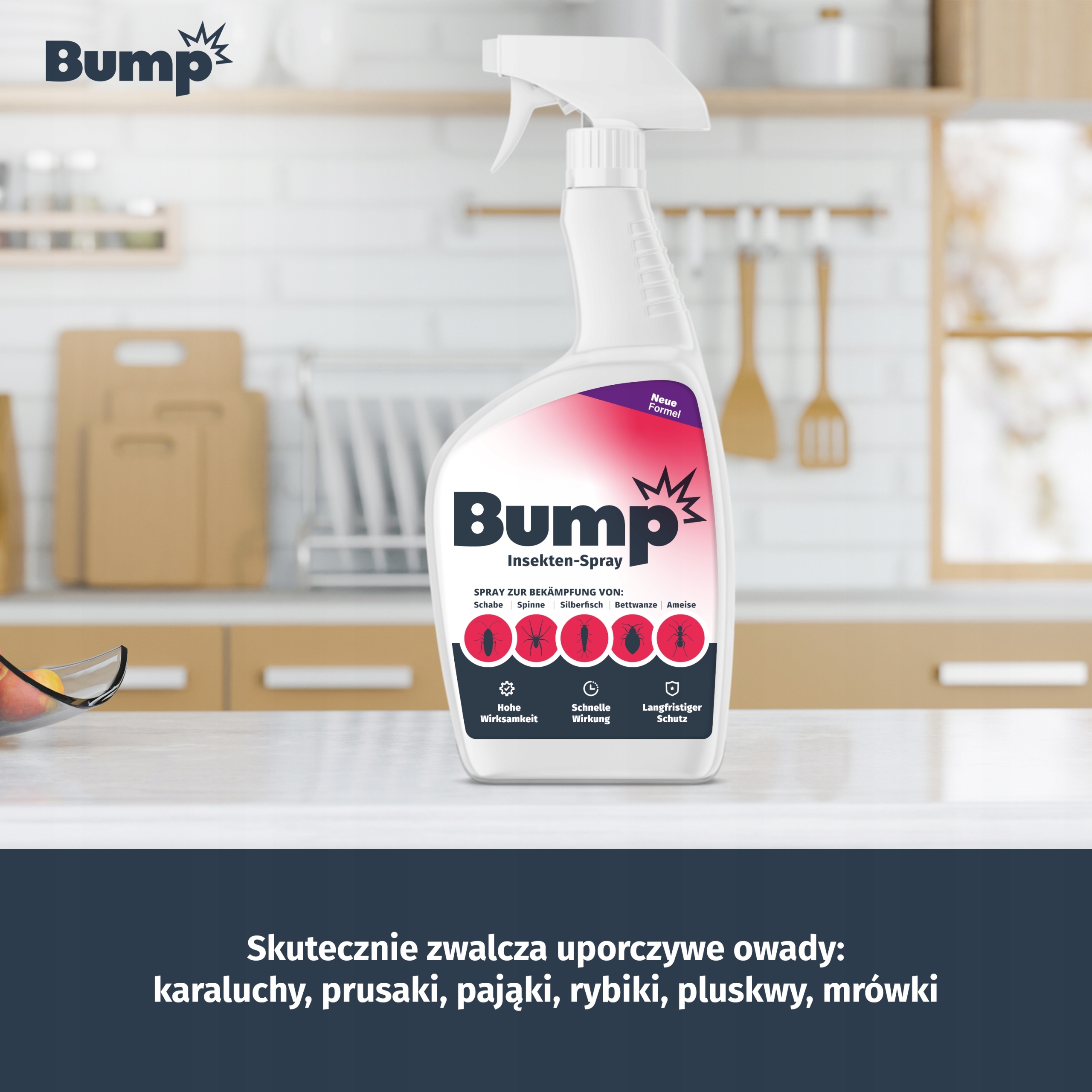 У вашому будинку з'явилися мурахи? Ваше горище повне павуків? Набридли сріблясті рибки у вашій ванній? А може, у вашому ліжку завелися клопи? Не хвилюйтеся, у нас є те, що допоможе вам позбутися проблеми! Відкрийте для себе BUMP INSEKTEN-SPRAY для боротьби з комахами, який усуває найдокучливіших комах, зокрема тарганів і тарганів.