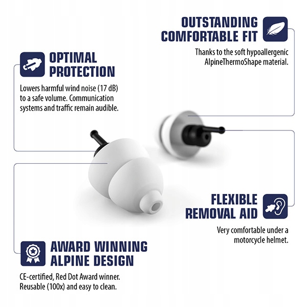 Заглушки знижують шкідливий шум вітру (17 дБ) до значень, безпечних для мотоцикліста. Системи дорожнього руху та зв’язку залишаються чудово чутними.