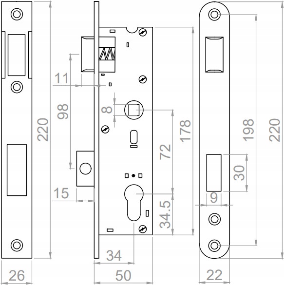 Касета із замком, виготовленим із прямокутного металевого профілю 60x40 мм. Універсальний дизайн касети дозволяє встановити більшість замків та дверних ручок, доступних на ринку, за умови згоди - всі ці елементи можна знайти в нашому магазині.