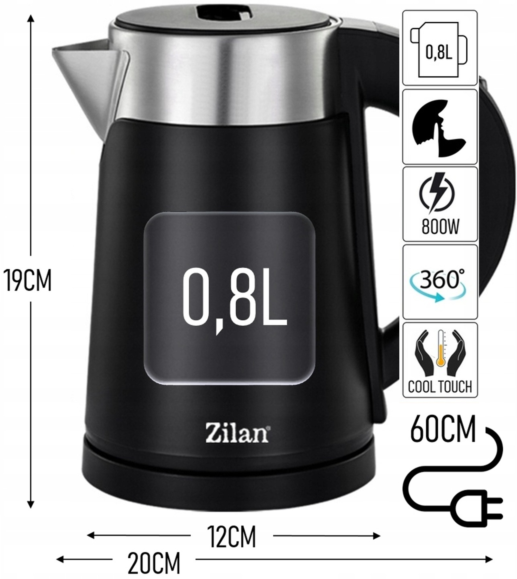 Внутрішня частина чайника виготовлена зSS STEEL. Це набагато краще рішення порівняно з традиційними пластиковими чайниками. У нього не потрапляють небажані хімічні сполуки. НЕ ЗМІНЮЄ СМАКУ ТА ЗАПАХУ КИП'ЯЧЕНОЇ ВОДИ.