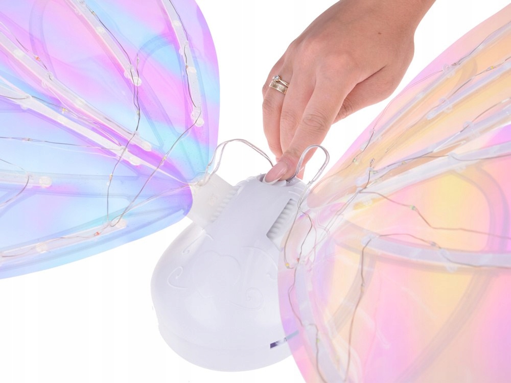 казково барвисті світиться крила - це інтерактивна іграшка, яка передає дітей у чарівний світ фантазії та пригод. Ці незвичайні крила оснащені ефективним світлодіодним освітленням, завдяки чому маленькі дівчата відчувати себе магічними феями. Після натискання кнопки, яка знаходиться між одним і іншим крилом - вони починаються. Перш за все, крила починають махати, сяяти, а також музику феї, щоб дитина могла відчути себе маленькою феєю з землі заклинань.