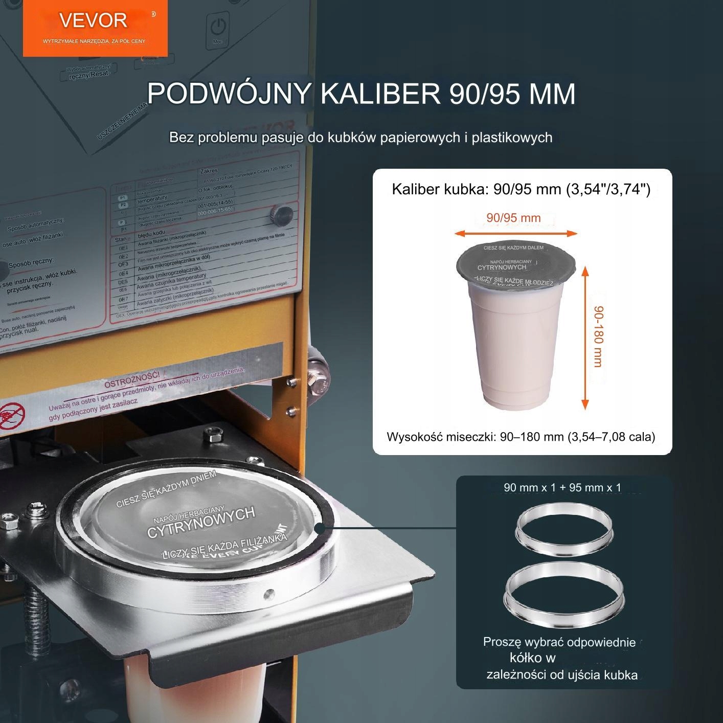 Машина для закриття кружки сумісна з чашками з висотою 90 мм до 180 мм і діаметром 90/95 мм. Підтримує чашки, виготовлені з PP, PE, PS та паперу та пластикових матеріалів.