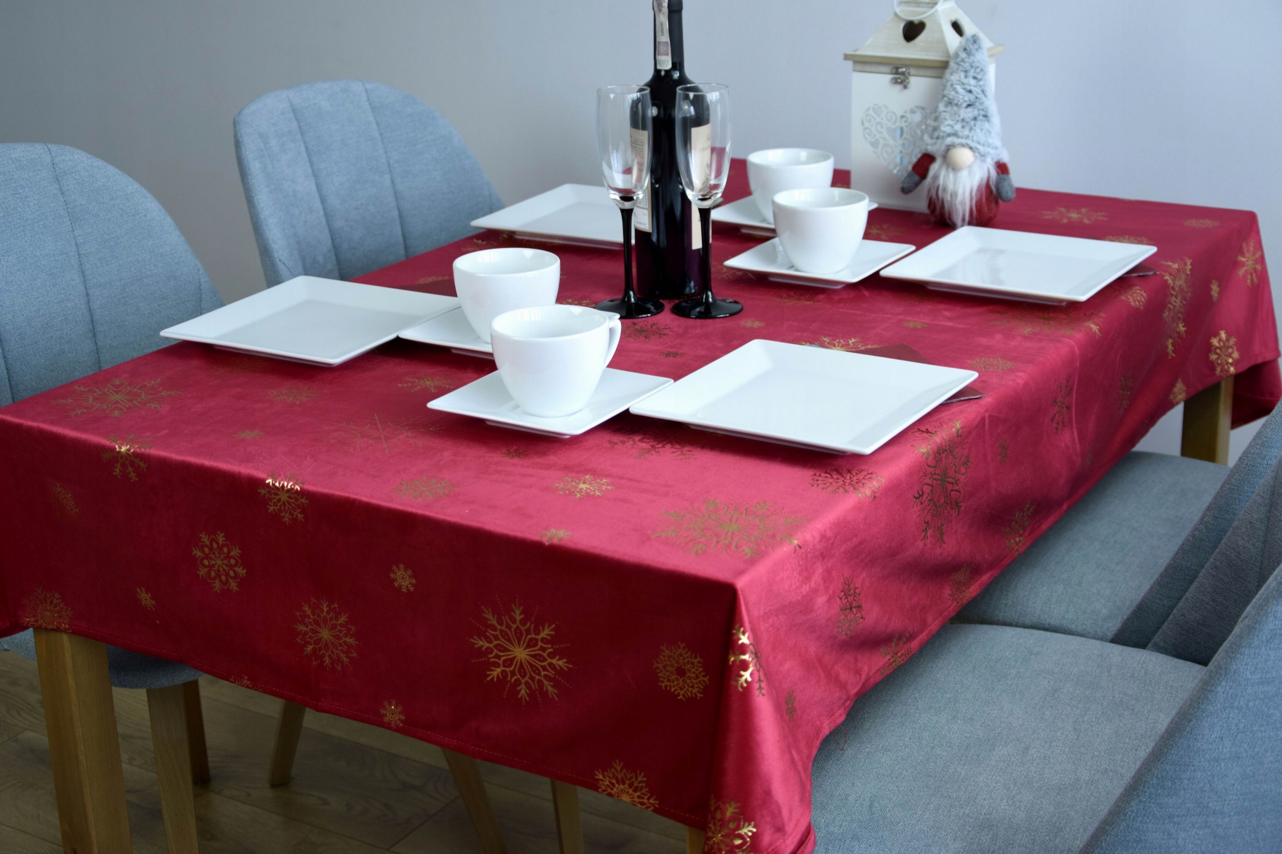 Червона РІЗДВОВА СКАТЕРТИНА Оксамит 110/160 Червона серветка ЗОЛОТИ СНІЖИНКИ
