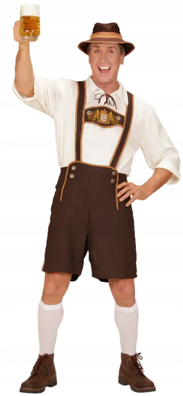 Баварський костюм Чоловічий баварський костюм - класичний натхненний традиційним костюмом баварського регіону, ідеально підходить для Октоберфесту, фестивалю пива, тематичних вечірок та костюмованих ігор. У комплект зазвичай входять коричневі короткі штани до коліна (Lederhosen) з характерними підтяжками і біла сорочка. Вбрання доповнює баварський капелюх і високі шкарпетки, що підкреслює автентичний фестивальний характер.