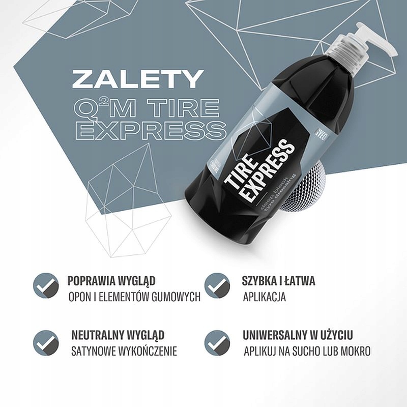 Q²M Tire Express забезпечує природний, напівматний візуальний ефект. Створює самооцінку, гідрофобний шар, який забезпечує чистоту шини і не зникає навіть після тривалої їзди під дощем.