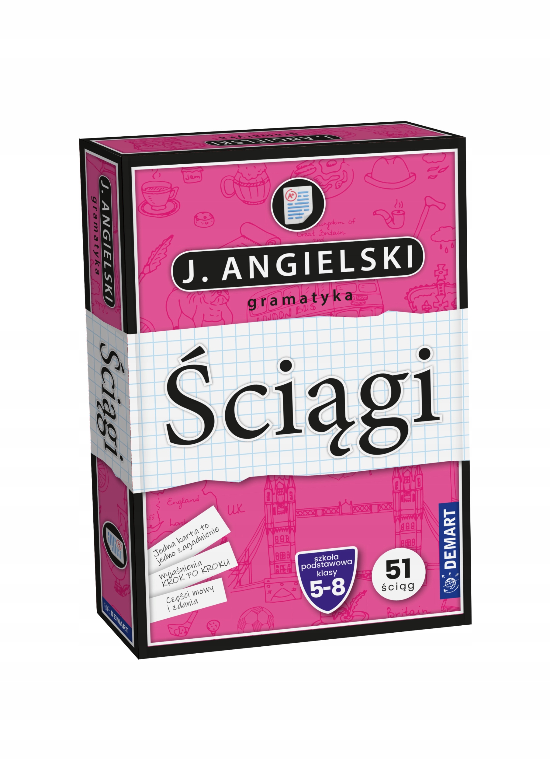 В упаковці 51 двостороння, барвиста, ретельно графічно оформлена розроблені шпаргалки охоплюють усі важливі теми граматики, включені до основної навчальної програми, включаючи: часи, способи, повідомлення, частини мови та речення, а також будову та сполучення речень.