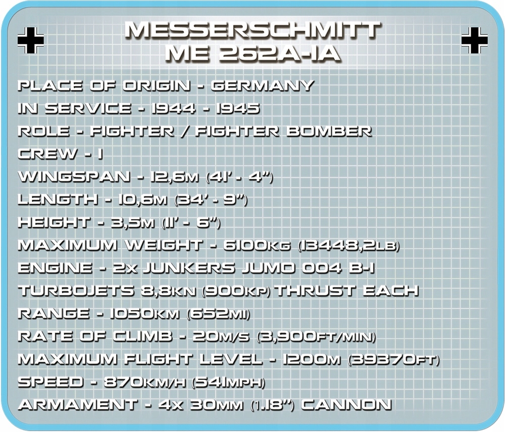 З 390 будівельних блоків Cobi ви побудуєте легендарний німецький літак з Другої світової війни! Цей прекрасний історичний літак був розроблений з увагою до деталей. Блоки були покриті високоякісними відбитками, які не стикаються навіть під час інтенсивного використання. Пофарбування літака відноситься до машини з дуже багатим минулим, яке в даний час знаходиться в Мюнхенському музеї. За кермом цієї надзвичайної машини ми можемо посадити статуетку, яка натхненна фігурою пілота Ганса Гвідо Мутке. Згідно з непідтвердженими повідомленнями, цей пілот вперше міг перевищити звуковий бар'єр! Весь набір доповнюється блок -підставкою та моделлю з назвою моделі.