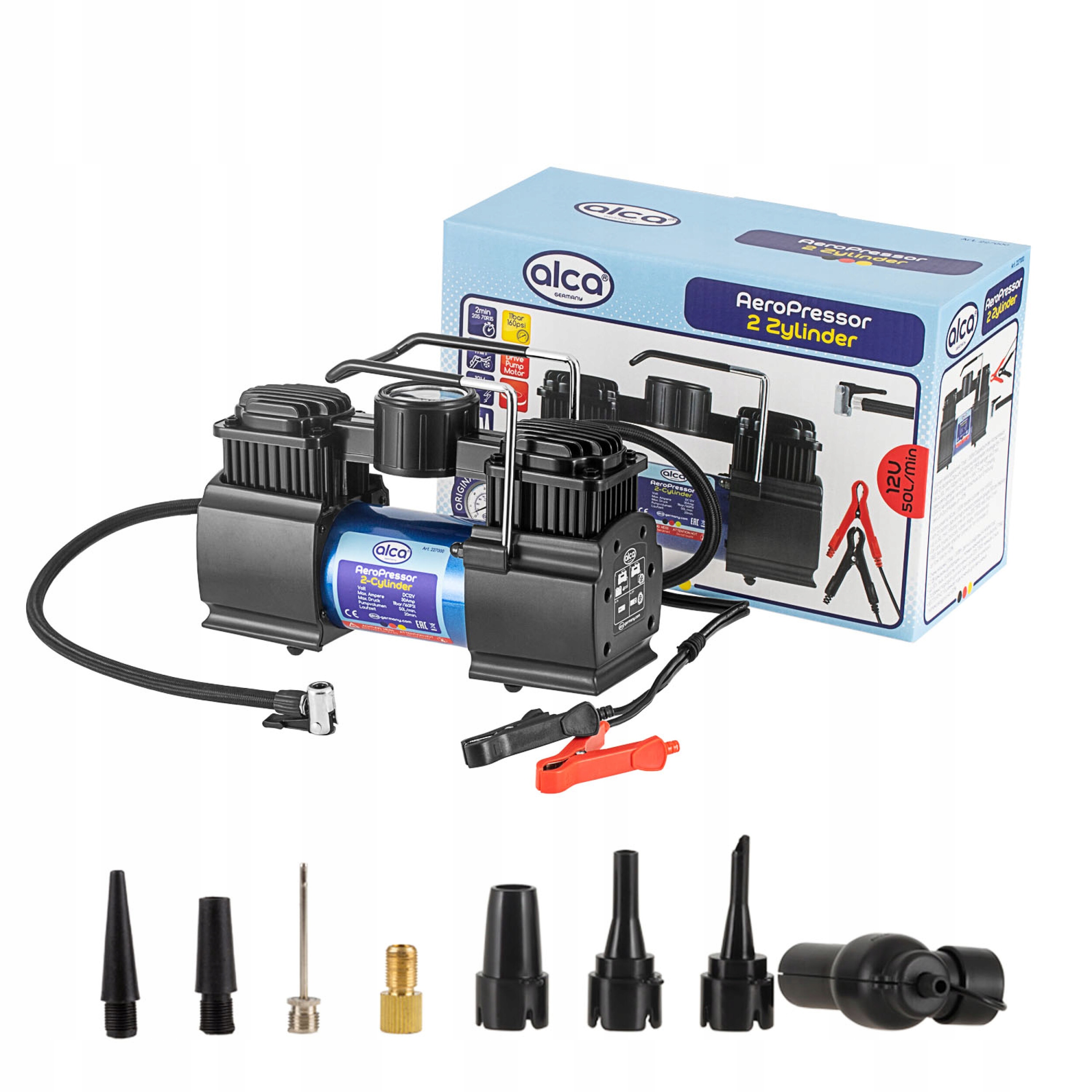2-циліндровий світлодіодний компресор ALCA 12 V-це надзвичайно сильний двоциліндровий компресор з ємністю 10 бар/300 Вт з 12 В-акумуляторними затискачами та точним датчиком тиску.