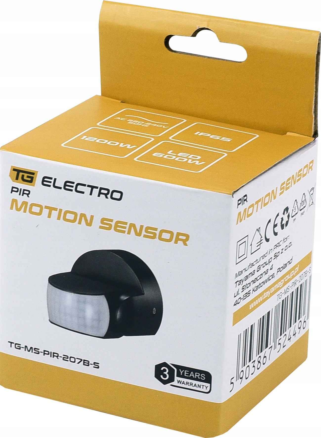 Датчик руху PIR, 360 °/180 °, 1200 Вт, IP65, поверхня, чорний водонепроникний
