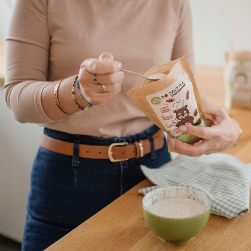 Порошкоподібні дати - унікальний продукт із широким застосуванням. Їх висушена форма у вигляді порошку ідеально доповнить смак каші, тортів та інших страв, додаючи їм солодощі - все це природно , не додаваючи цукру. У практичній упаковці з рядком ви знайдете лише 100% екологічні дати - немає інших інгредієнтів!