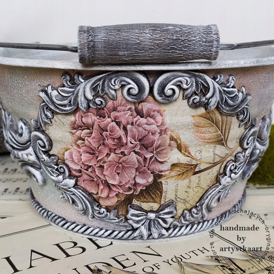 - гарний мотив гортензії в приглушених кольорах, опуклі декори із затверділої пластичної маси