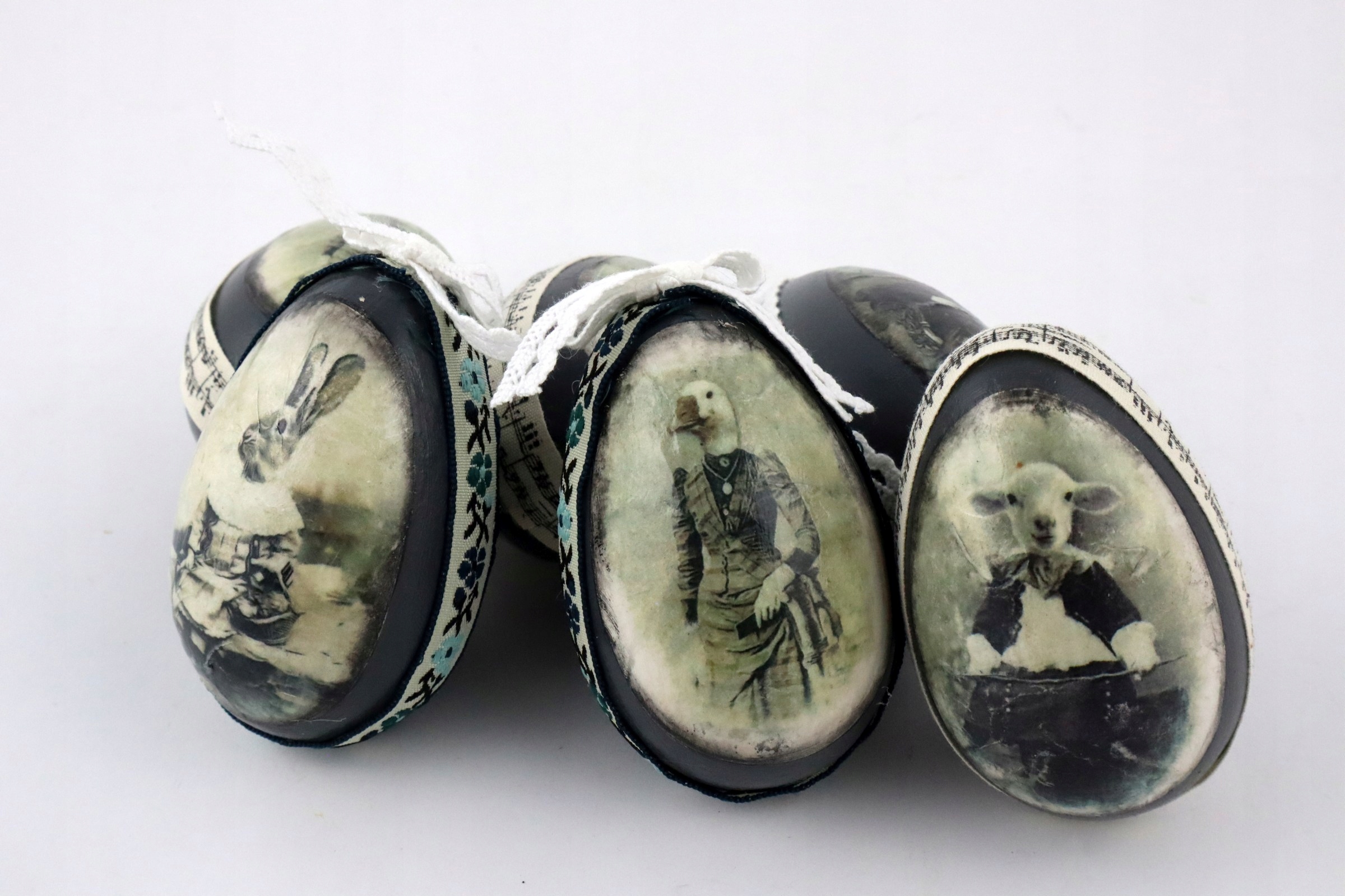 Кожне яйце показує фігуру з людським тілом і головою тварини, такими як кролик, гусак, зайця, ягня або коза - натхненна ретро -стилем та колишнім фото портретом. Це прикраса, яка привертає увагу і викликає посмішку. 4 Кожне яйце має декоративну стрічку і лук і було захищено безбарвним акриловим лакам, безпечним для дітей - те саме, що використовується у виробництві дерев’яних іграшок.
