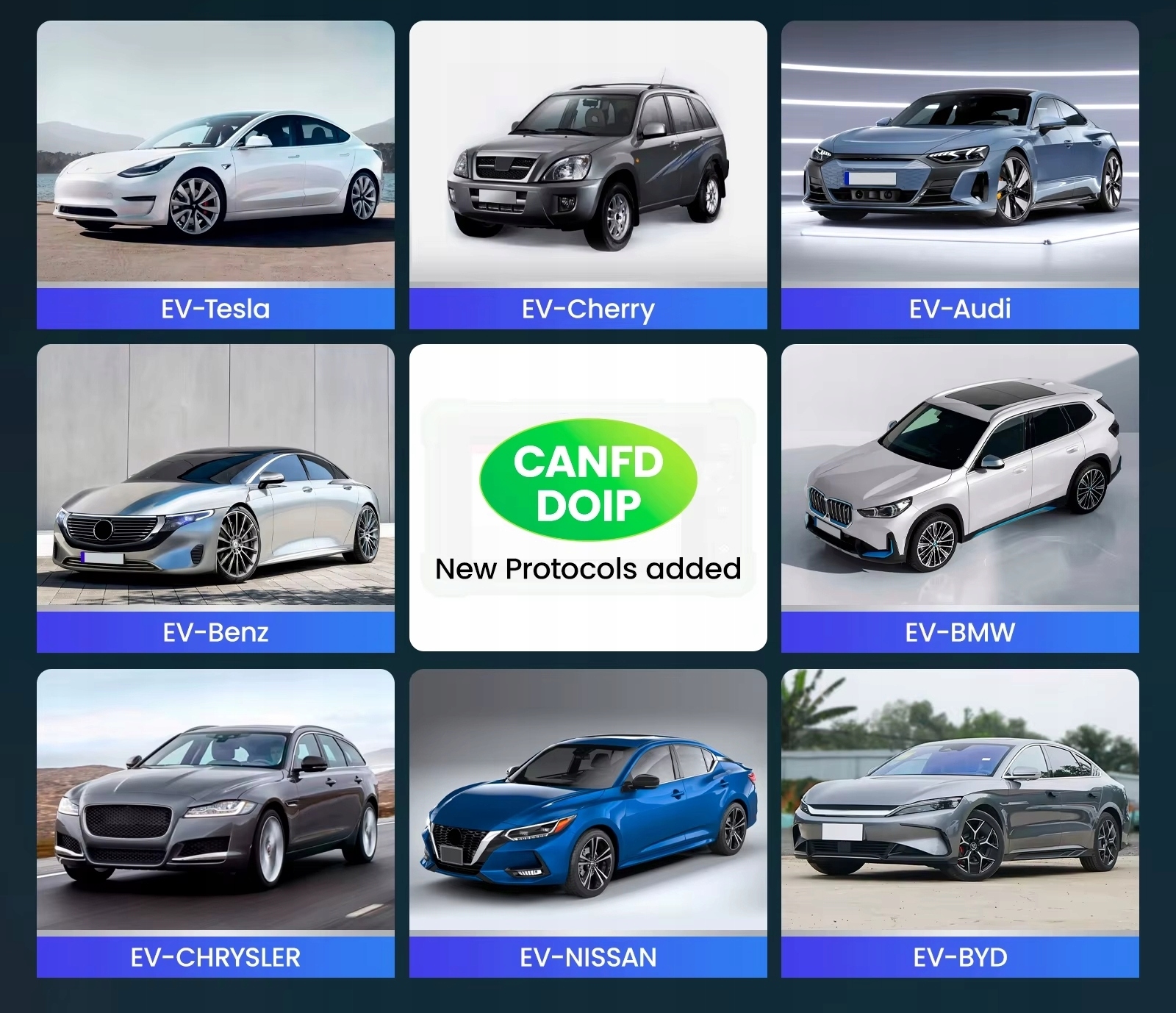 - doip - сумісна з моделями BMW (F&G), Volvo (з 2018 року), Land Rover, Jaguar (з 2017 року) - забезпечує більш швидку діагностичну комунікацію.