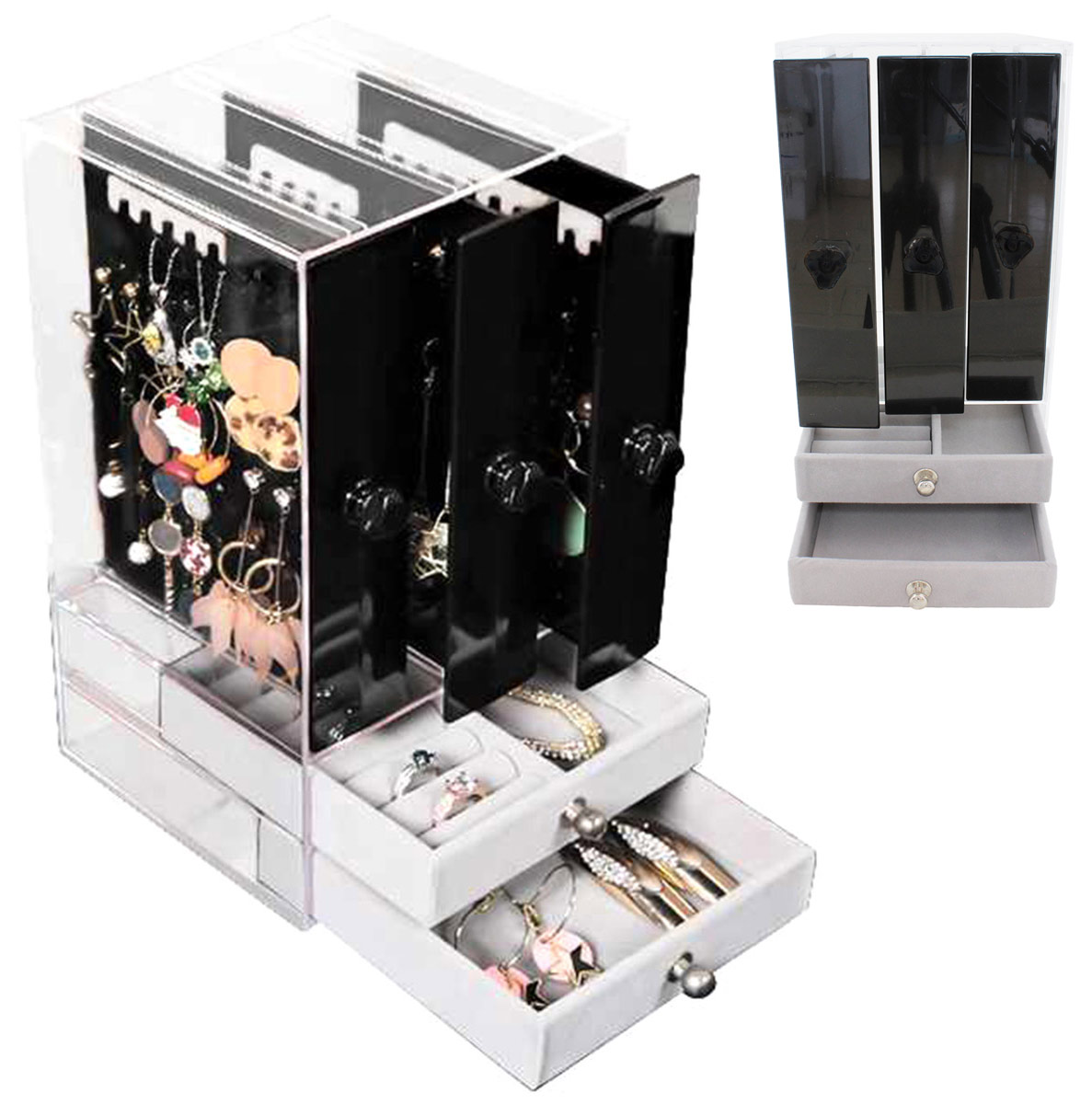 Організатор ювелірних виробів з трьома витяжними ящиками, які дозволяють повісити браслети або сережки вертикально