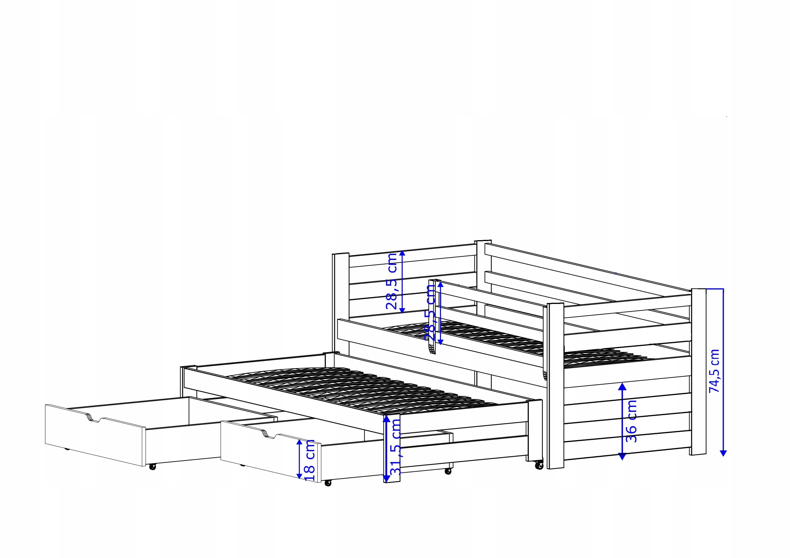Дитяче ліжко містить друге висувне місце для спального місця. Це забезпечує спальне місце для двох братів і сестер. розширювана колода коротша на 10 см довжиною, ніж головна колода.