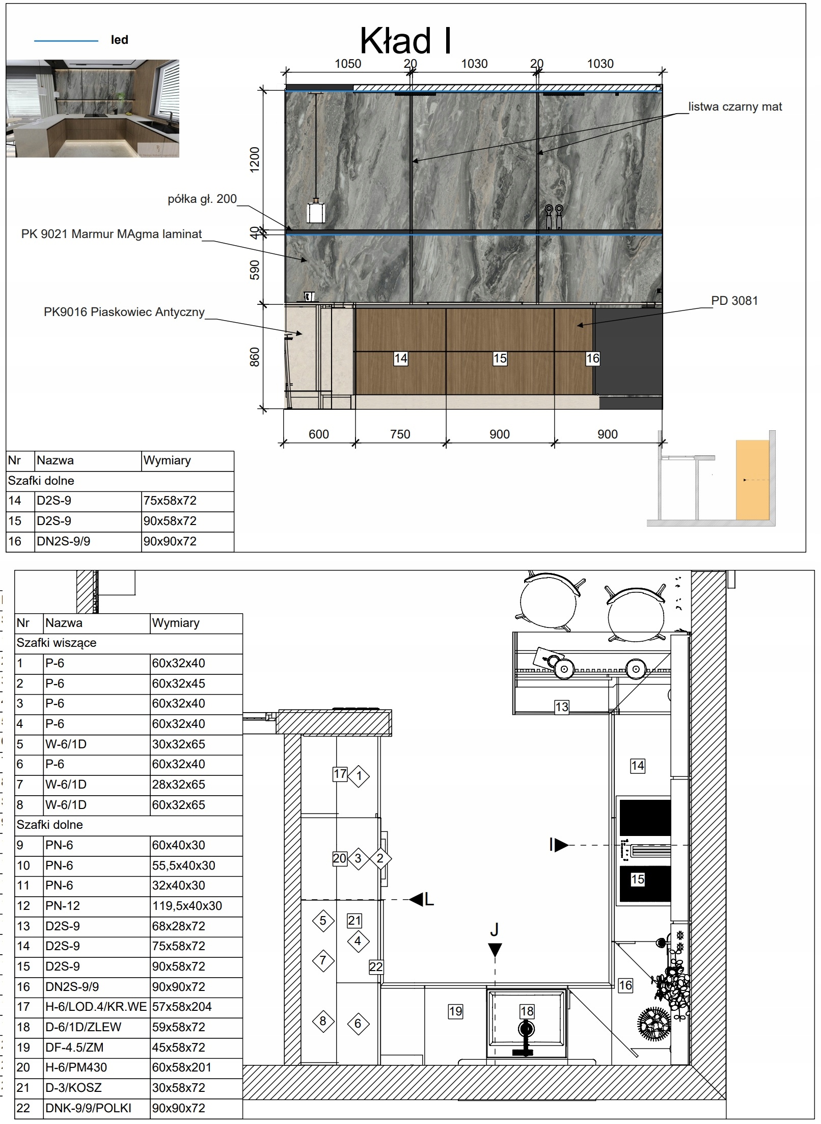 - Технічне креслення з урахуванням розмірів будівельних елементів (кухні, шафи, шафи, стелі тощо)