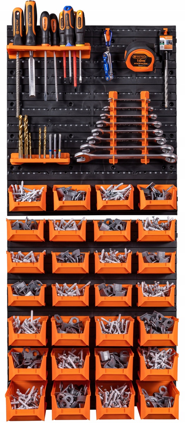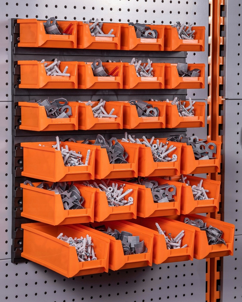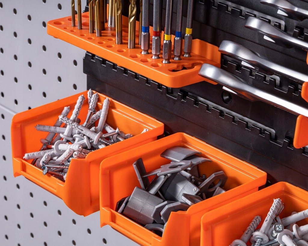 b>. Гачки, полиці та тримачі різних типів призначені для різних типів ручних інструментів, а 28 контейнерів у 3 розмірах можуть вмістити гвинти, болти, шайби та інші аксесуари.
