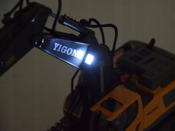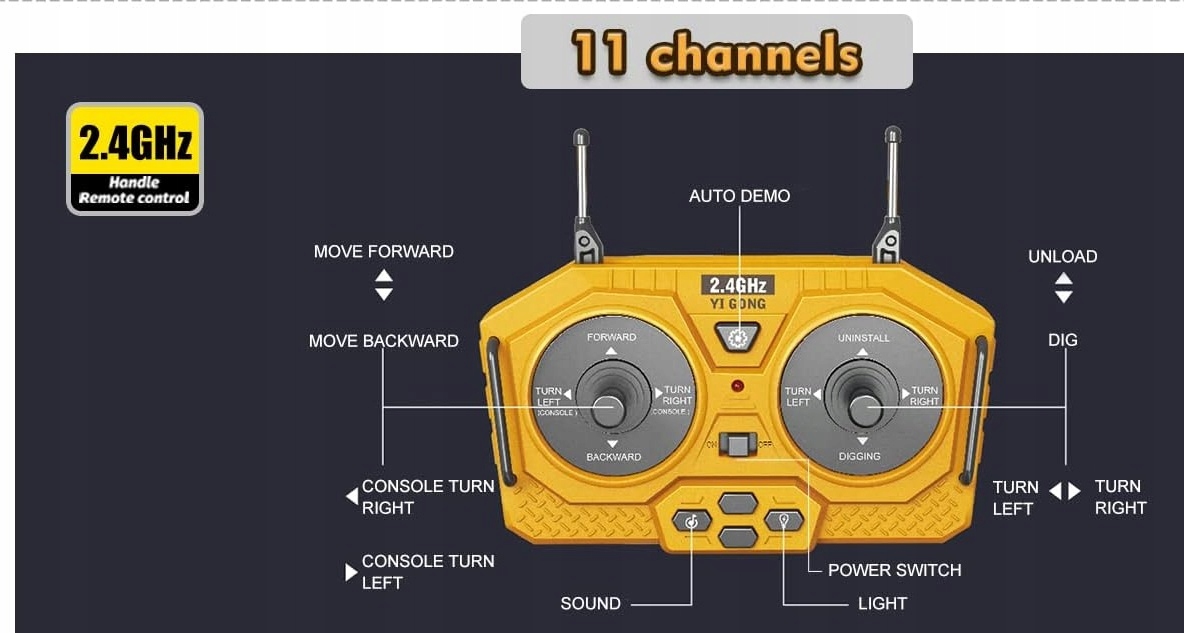 - Просунута 11 канал, жовтий пілот 2,4 ГГц дозволяє точно керувати рухом транспортного засобу: рухатися вперед, назад, ліворуч, праворуч, праворуч, а також обертання кабіни на 680 градусів, рамка екскаватора підняв вниз