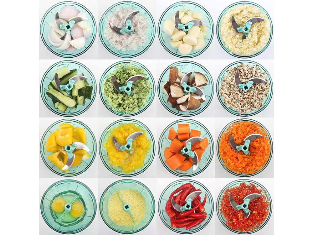 Подрібнювач дуже простий у використанні. Просто помістіть необхідні інгредієнти в контейнер, підключіть до джерела живлення та скористайтеся кнопкою у верхній частині пристрою, щоб запустити слайсер.