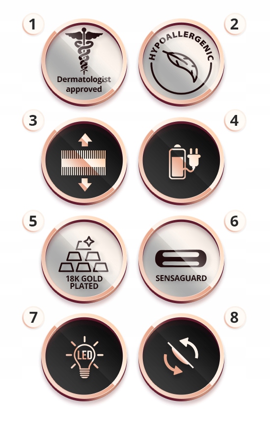 - Стимулює шкіру, забезпечуючи більший комфорт завдяки активним пульсуючим вібраціям, роблячи епіляцію ще більш ніжною.