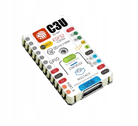 Мініатюрний модуль із видатними параметрами з сучасним 32-розрядним мікроконтролером RISC-V ESP32-C3U 160MHz та 4 МБ флеш-пам'яті. Він підтримує бездротову передачу WIFI і Bluetooth 5(LE) і механізми шифрування RSA-3072 AES-128-XTS. Конвертер USB<->UART, що забезпечує передачу даних між комп'ютером і модулем, вбудовано безпосередньо в мікроконтролер. Якщо комп’ютер не розпізнає плату, вставляючи її в USB-порт, натисніть і утримуйте кнопку, розташовану по центру над світлодіодом RGB.