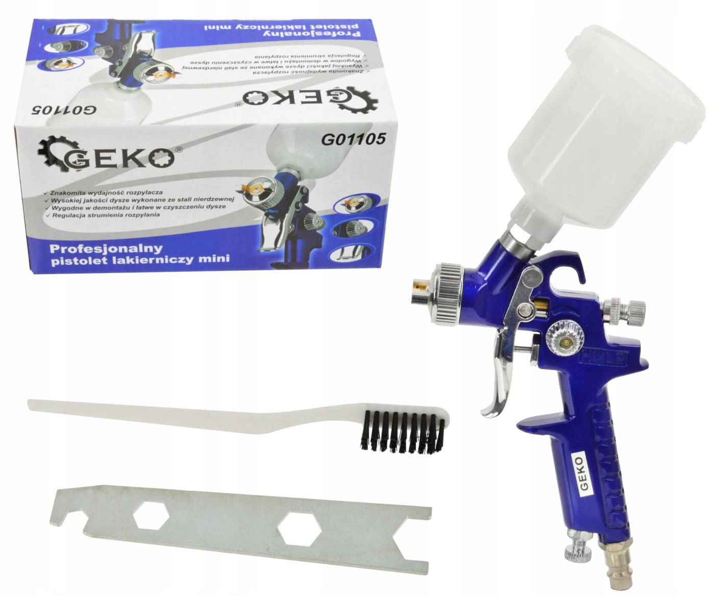 Професійний пістолет з низьким тиском HVLP . Виготовлений з найкращих якості матеріалів. Пістолет годується стисненим повітрям . Повітря з компресора досягає резервуару для фарби та насадки пістолета. Отриманий тиск "штовхає" рідину з резервуара, а молекули розпилюваної фарби викидаються через насадку на лаковану поверхню.