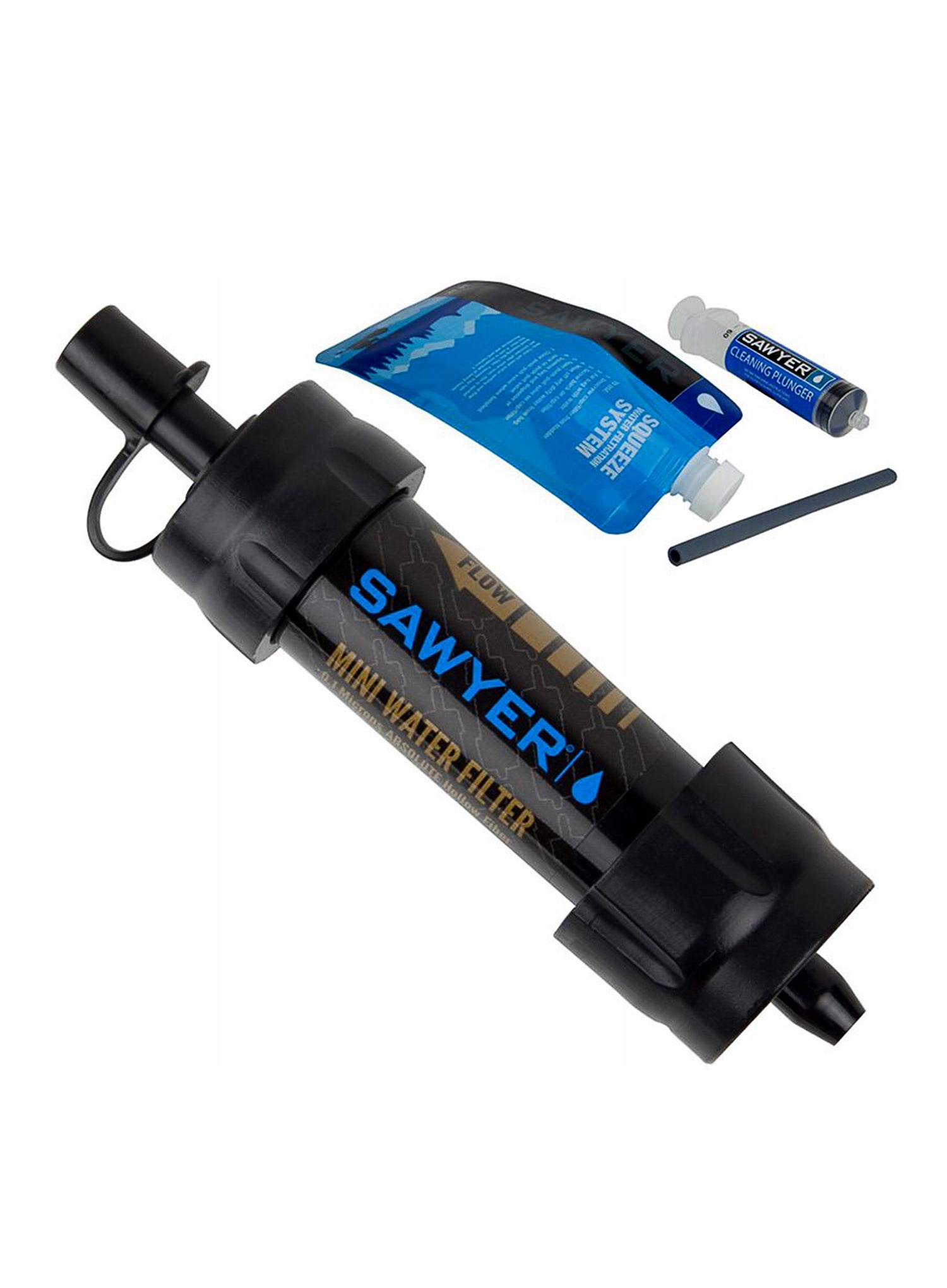 - У набір входить: міні-фільтр для води Sawyer, згорнута пляшка 470 мл з кришкою, шланг для кріплення фільтра, що дозволяє пити воду прямо з джерела, як через соломинку, шприц для очищення фільтра;