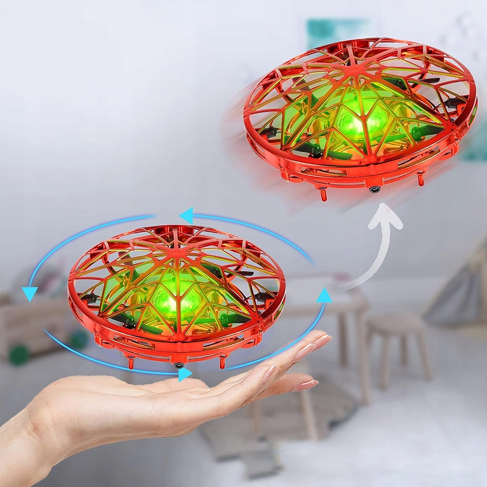 Дрон UFO автоматично піднімається та опускається та рухається горизонтально відповідно до датчиків із 5 датчиками руху. Для дітей використовуються дрони з ручним керуванням для виявлення перешкод поблизу. Перешкод не видно, це спуск. Коли міні-дрон, квадроцикл, левітуючий НЛО стикається з чимось, він негайно вимикається.