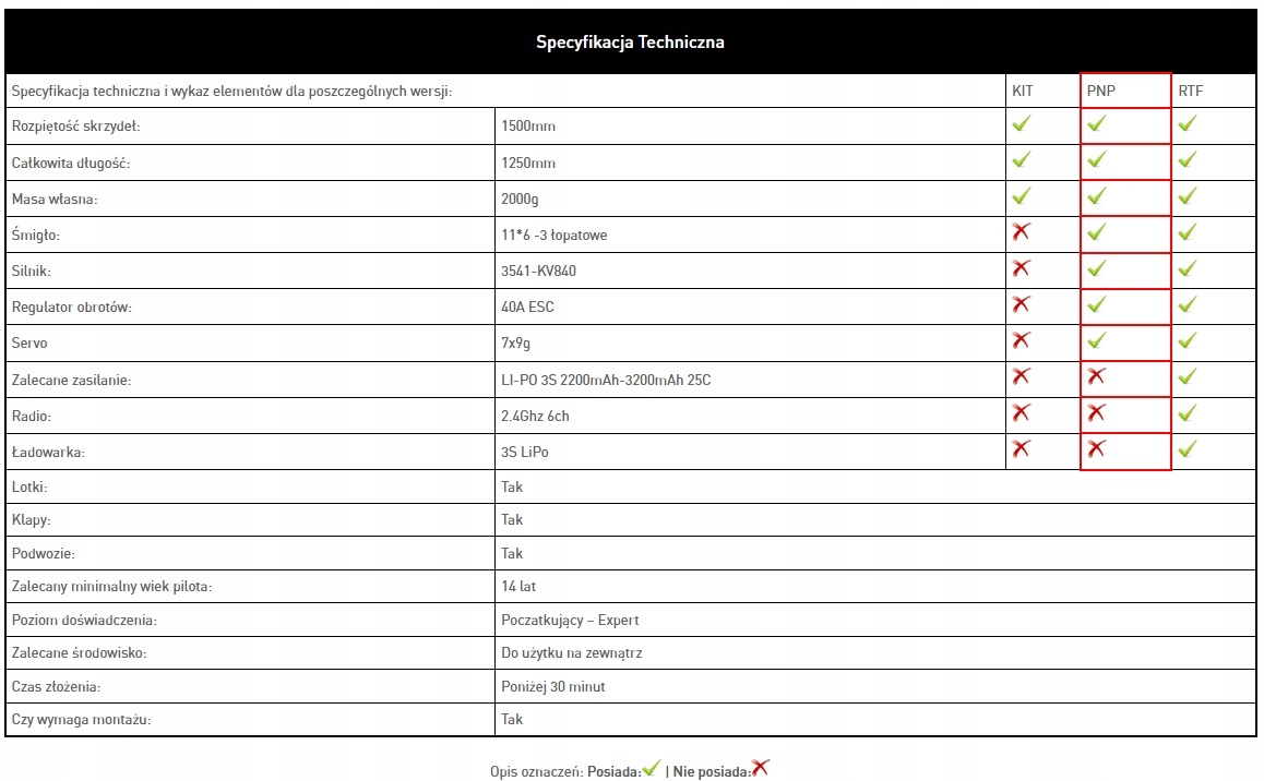 Літак у версії PNP, в комплект входить модель, шасі, двигун, регулятор і сервоприводи. Ви повинні придбати акумулятор, зарядний пристрій, передавач і приймач самостійно.