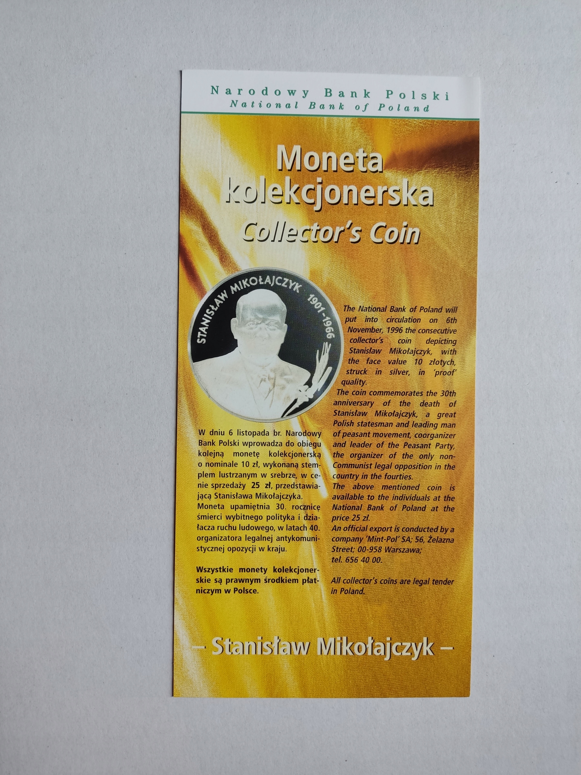 Folder NBP 1996 Stanisław Mikołajczyk j.polski